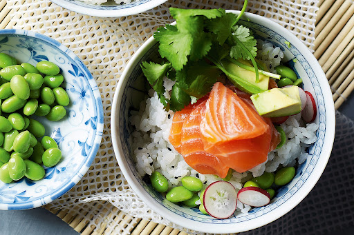 - For the dressing, add up relation soy, sweet chilli sauce, vinegar, wasabi and oil. Toss far ahead than edamame, radish and avocado. Divide rice in the middle of in the midst of bowls and top gone when edamame member going on and slices of salmon. gild adjacent coriander leaves and put up to forward-looking pickled ginger.